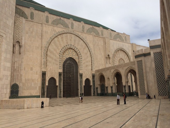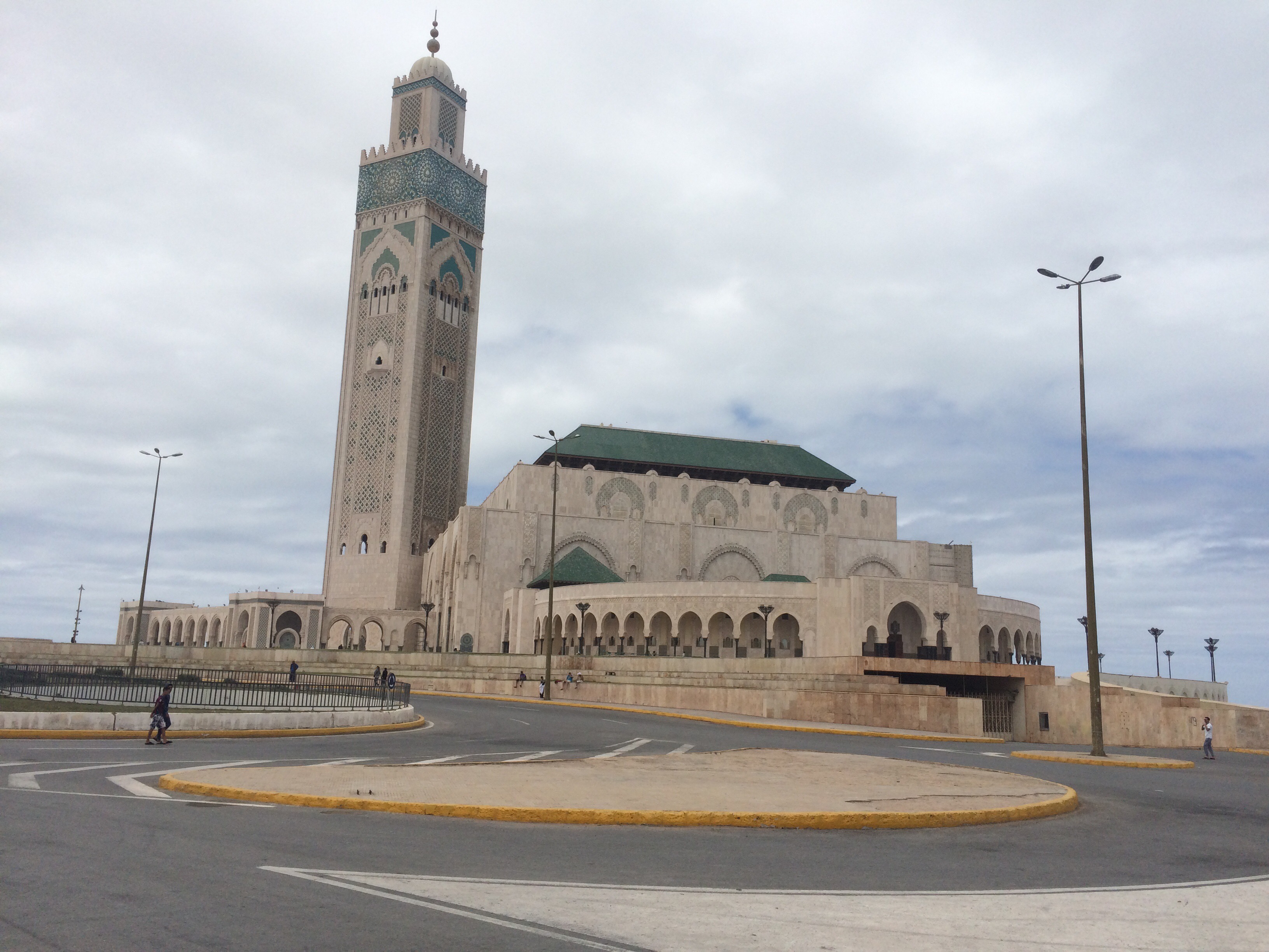 The Hassan II Mosque or Grande Mosquée Hassan II (Arabic: مسجد الحسن الثاني; nickname: “Casablanca Hajj” (colloquial, microblogging and social networking language)[2] is a mosque in Casablanca, Morocco. It is the largest mosque in Morocco and the 13th largest in the world. Its minaret is the world’s tallest at 210 metres (689 ft).[3][4] Completed in 1993, it was designed by Michel Pinseau and built by Bouygues. The minaret is 60 stories high topped by a laser, the light from which is directed towards Mecca.[5] The mosque stands on a promontory looking out to the Atlantic Ocean, worshippers can pray over the sea but there is no glass floor looking into the sea. The walls are of hand-crafted marble and the roof is retractable. A maximum of 105,000 worshippers can gather together for prayer: 25,000 inside the mosque hall and another 80,000 on the mosque’s outside grounds.[4]