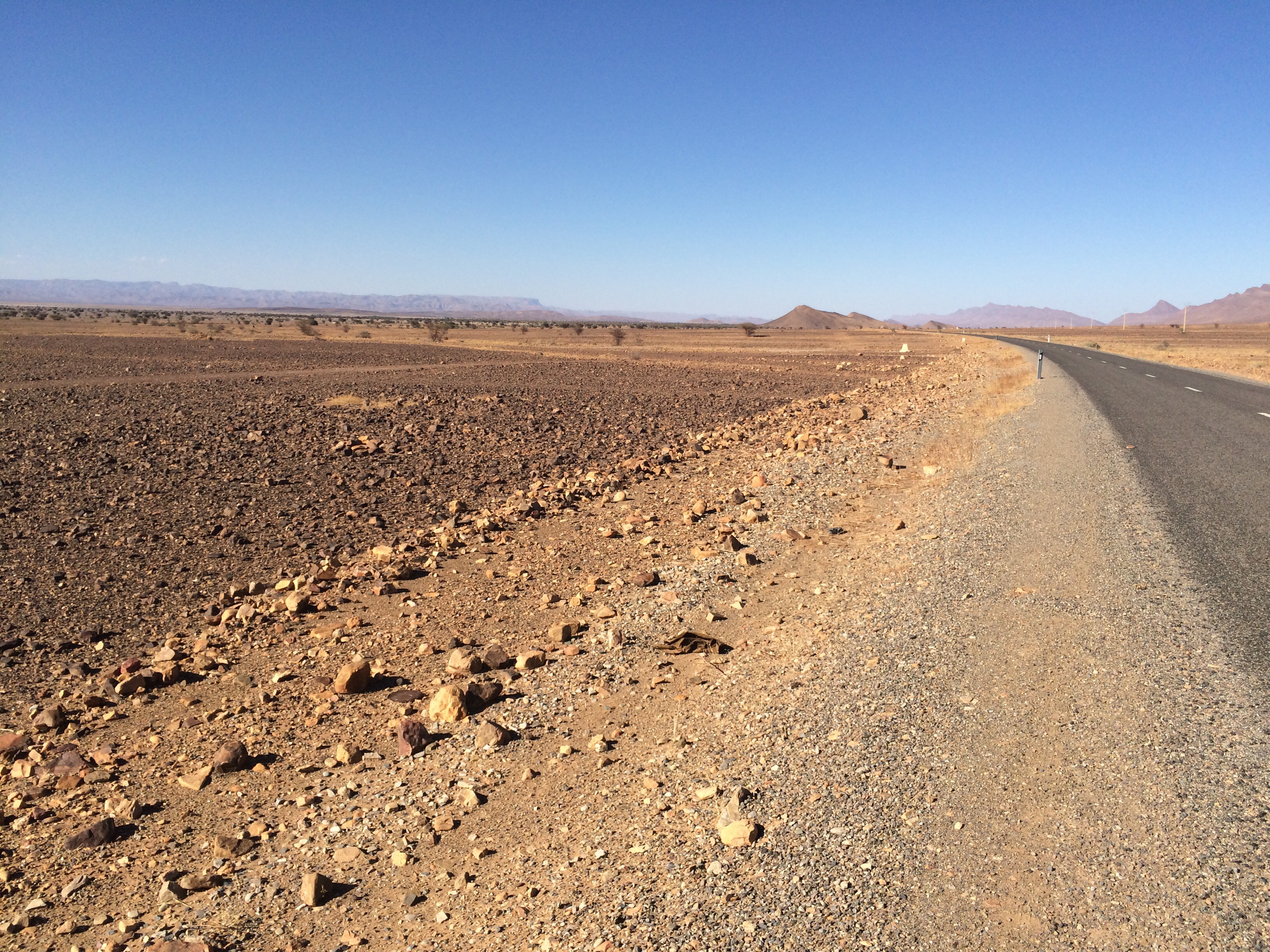 I say: It is desert and it is remote. Very remote. Perfect, I say, versus the hustle and bustle of Casa and Marrakech. In the occasional oasis towns I was more likely to see a woman walking alongside a donkey that was hauling alfalfa or olives than another vehicle. No tour busses out here, not even the 4WD excursions for intrepid travelers. Many wild burros or jackasses, once in a while I would see a herd of goats and a shepherd. But mostly nothing.