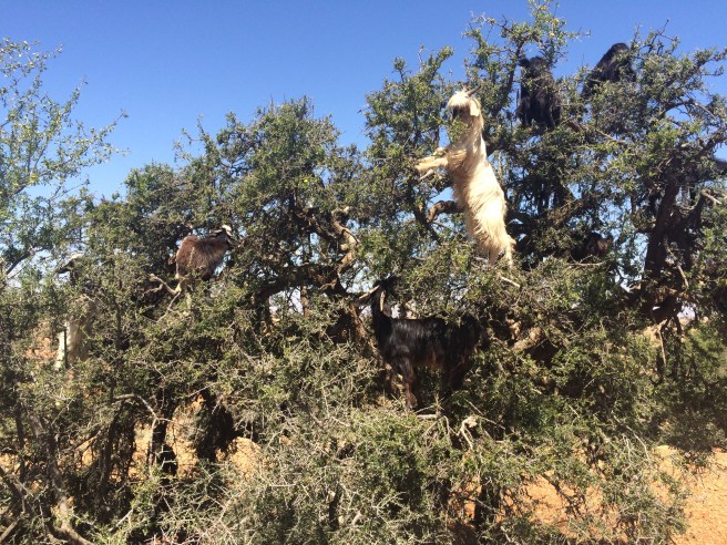 Goats climbing an olive tree for a meal. At least a dozen were in the tree. They climbed around the tree like spiders.