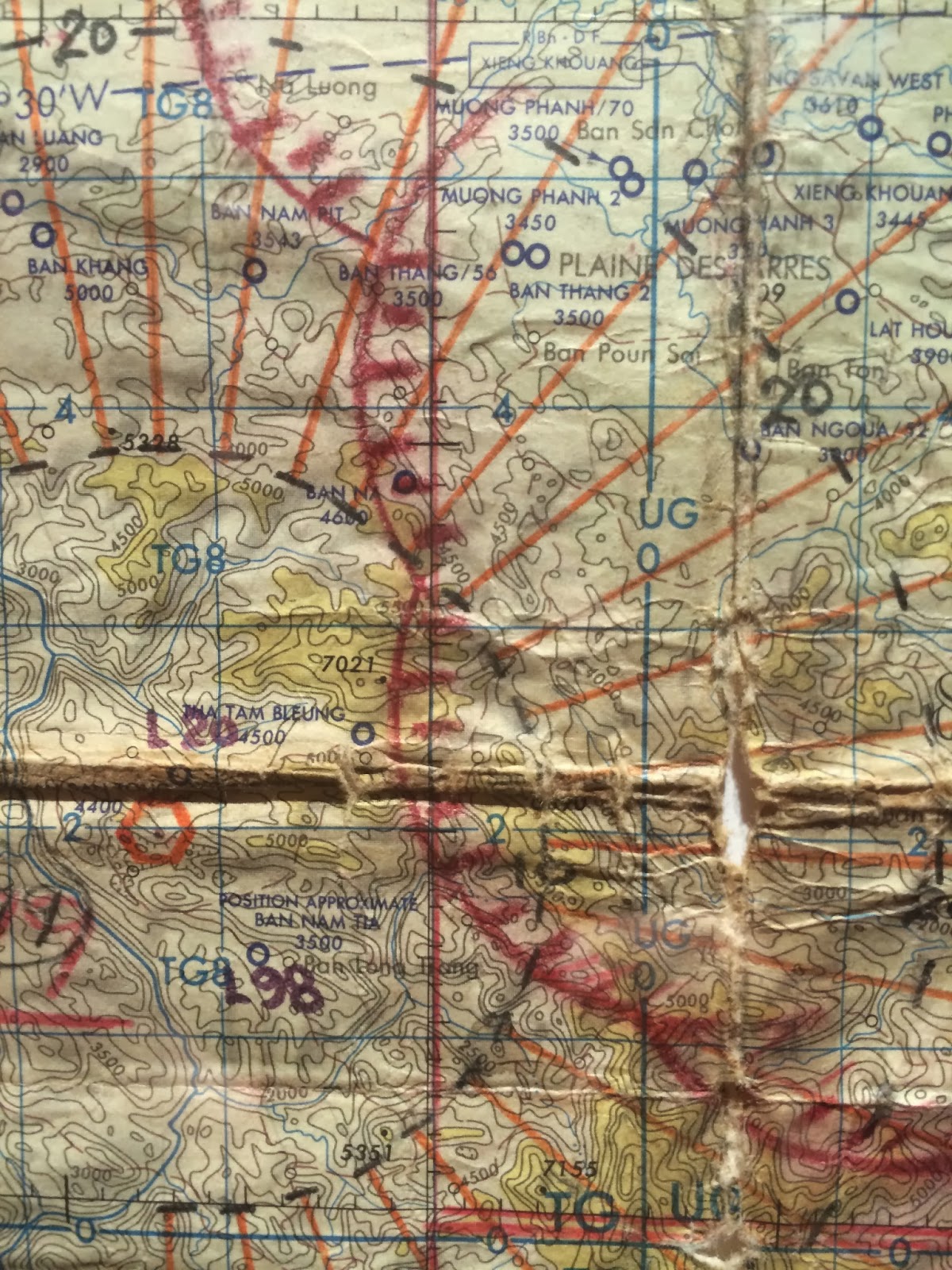 The closeup of the map at the bottom of the page shows an area about 60 to 80 miles NNE of Vientiane, Laos. L98 is Long Tieng – often described as “The Most Secret Place on Earth”. I had the map framed and look at it daily. Considerable research resulted in an understanding of places and numbers on the map. My father never told me much about it or about what he was doing………but with much of the war in SE Asia now declassified and the power of the internet, I think I figured some of it out……. My father drew the lines, the numbers for the radio beacons, the distances from the beacons, the landing strips (Lima Sites). All the edges were cut off the map. It had been folded, refolded, creased, crinkled, crunched and folded again. It was obvious that it had been used very heavily.