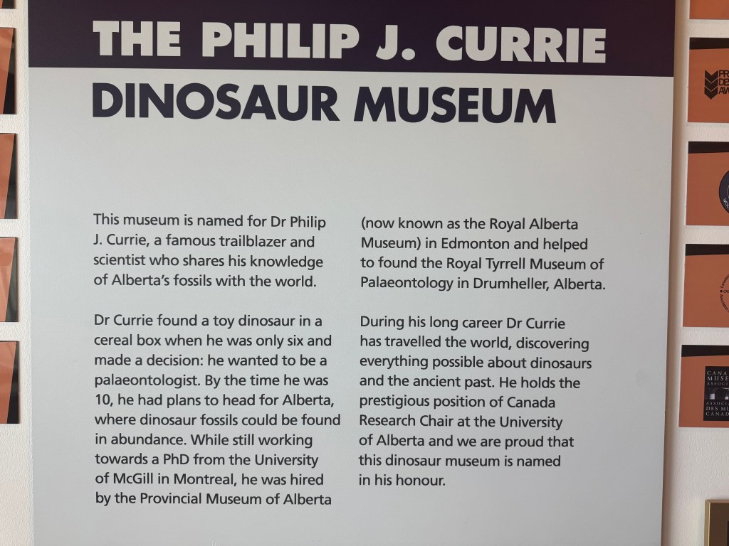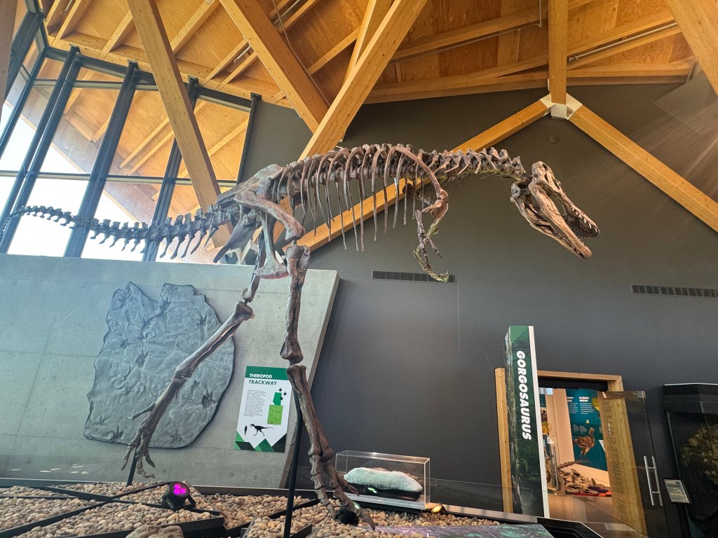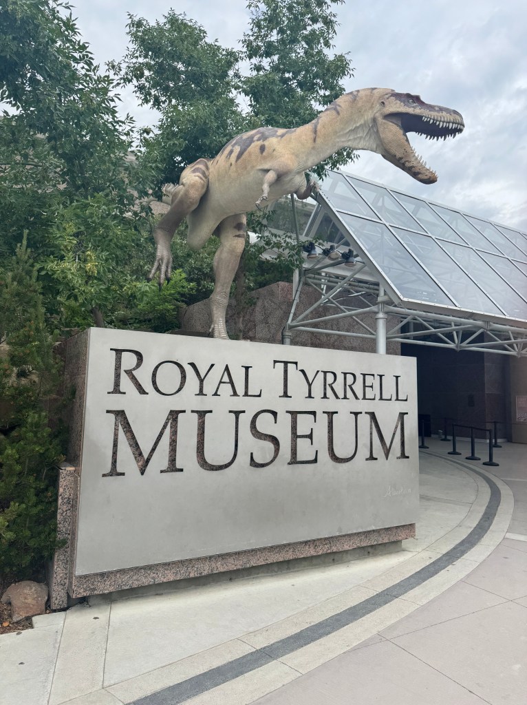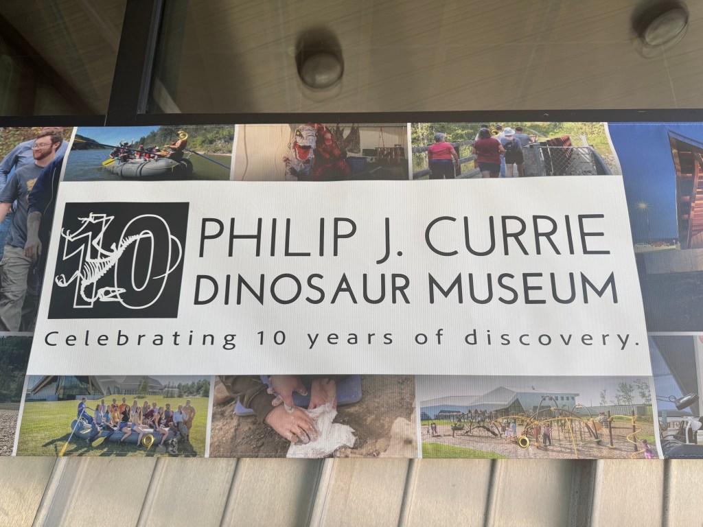 We stopped at the Currie Dinosaur Musuem about 12 miles west of Grand Prairie around 10AM. Not as expansive and impressive as the Tyrrell in Drumheller, but still interesting. Lots of dino footprint exhibits – over 10,000 dinosaur footprints have been found in the vicinity of Grand Cache, south of here. There was an especially interesting and informative video interactive display of plate tectonics over the last 500 million years.