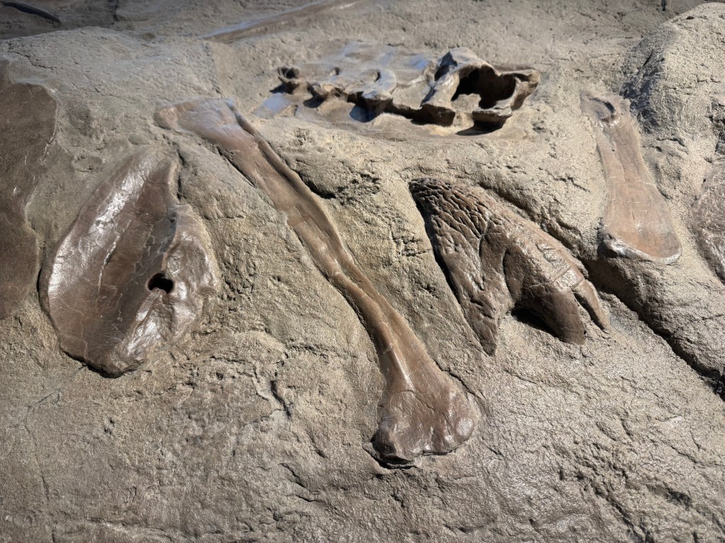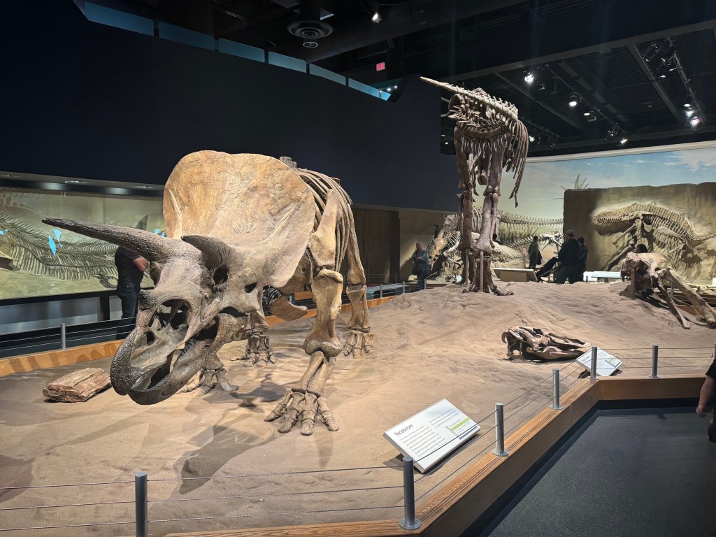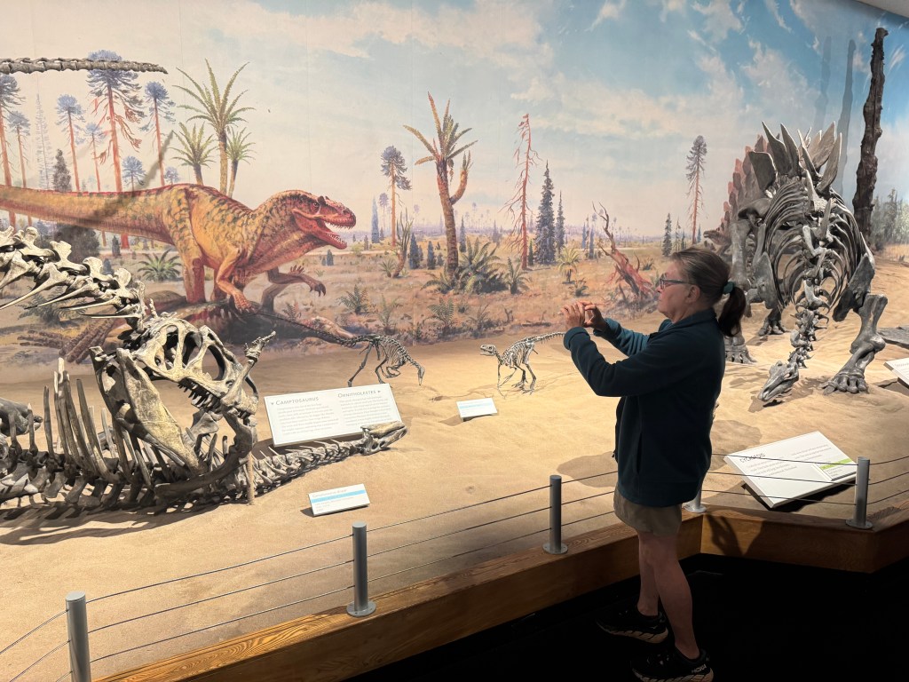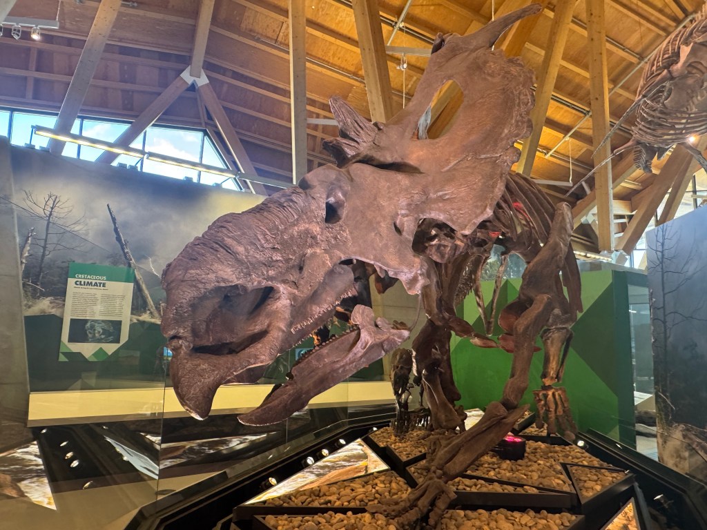 We stopped at the Currie Dinosaur Musuem about 12 miles west of Grand Prairie around 10AM. Not as expansive and impressive as the Tyrrell in Drumheller, but still interesting. Lots of dino footprint exhibits – over 10,000 dinosaur footprints have been found in the vicinity of Grand Cache, south of here. There was an especially interesting and informative video interactive display of plate tectonics over the last 500 million years.